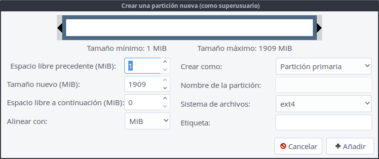 Podemos eliminar la partición y crear una Nueva. Este botón se habilitará cuando sea un espacio libre. En este caso tenemos un disco que hemos borrado la partición y queremos crear una nueva. Es importante fijarse en qué tipo de sistema de archivos queremos, ya que si escogemos ext4 solamente podrá ser leído por linux. Si se trata de un disco extraíble que vamos a compartir con otros sistemas operativos es conveniente escoger fat32.