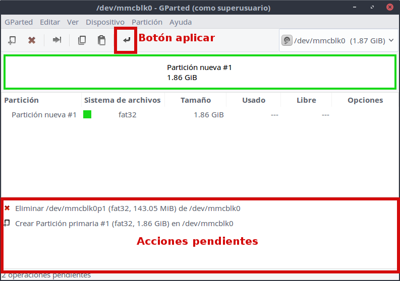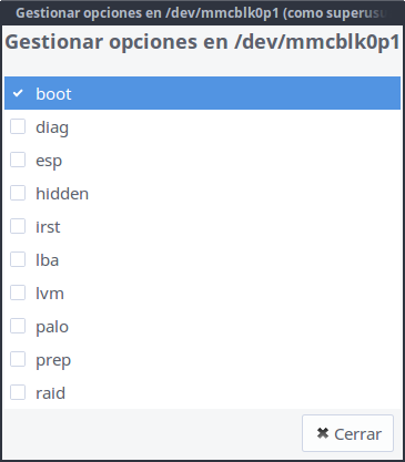 Cuando finalice podemos cambiar también las opciones de la partición. Si esta va a ser una partición de arranque podemos ir al Menú contextual > Opciones y seleccionar la opción boot (como para crear una tarjeta sd de arranque de sistema para Raspberry):