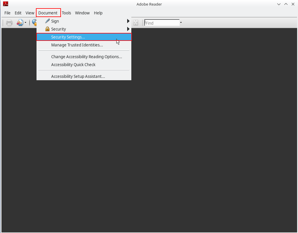 Una vez se dispone del fichero del certificado se abrirá Acrobat Reader y en la opción Documents de la barra de herramientas se seleccionará la opción Security Settings.