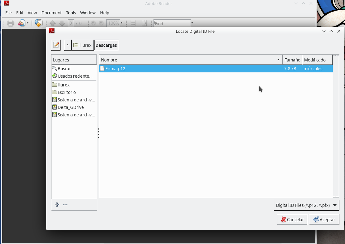 Para importar un certificado digital en Acrobar Reader lo primero será disponer del fichero del certificado que se quiere importar con la extensión .p12.