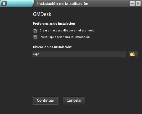 Una vez seleccionamod la aplicación a instalar nos aparecerá un menú de instalación. En este caso estamos instalando una aplicación llamada GMDesk.