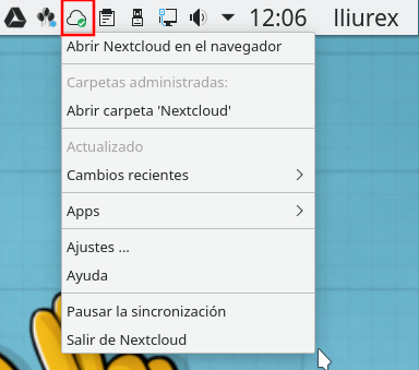En la bandeja del sistema se mostrará un icono que nos avisa del estado de sincronización y que permite intereacturar con Nextcloud Desktop. Haciendo clic con el botón derecho del ratónsobre el mismo se mostrará la lista de acciones disponibles