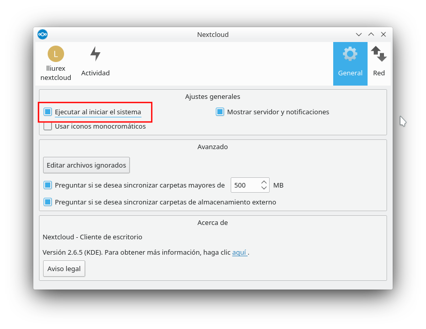 Por ejemplo si se desea que el Nextcloud Desktop se ejecute de forma automática al iniciar sesión en el equipo de marcará la casilla correspondiente.