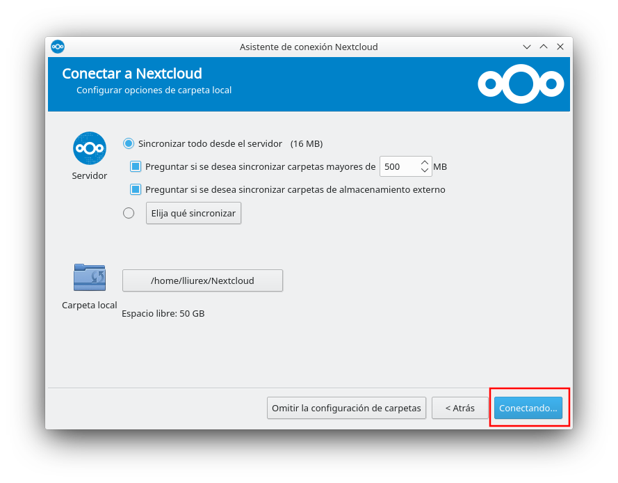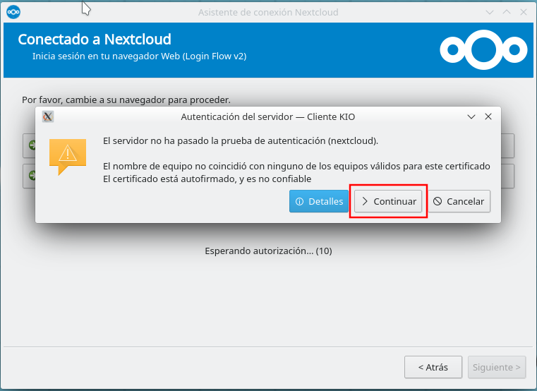 Trás cerrar el navegador en la ventana del Nextcloud Desktop se hará clic en “Conectando”