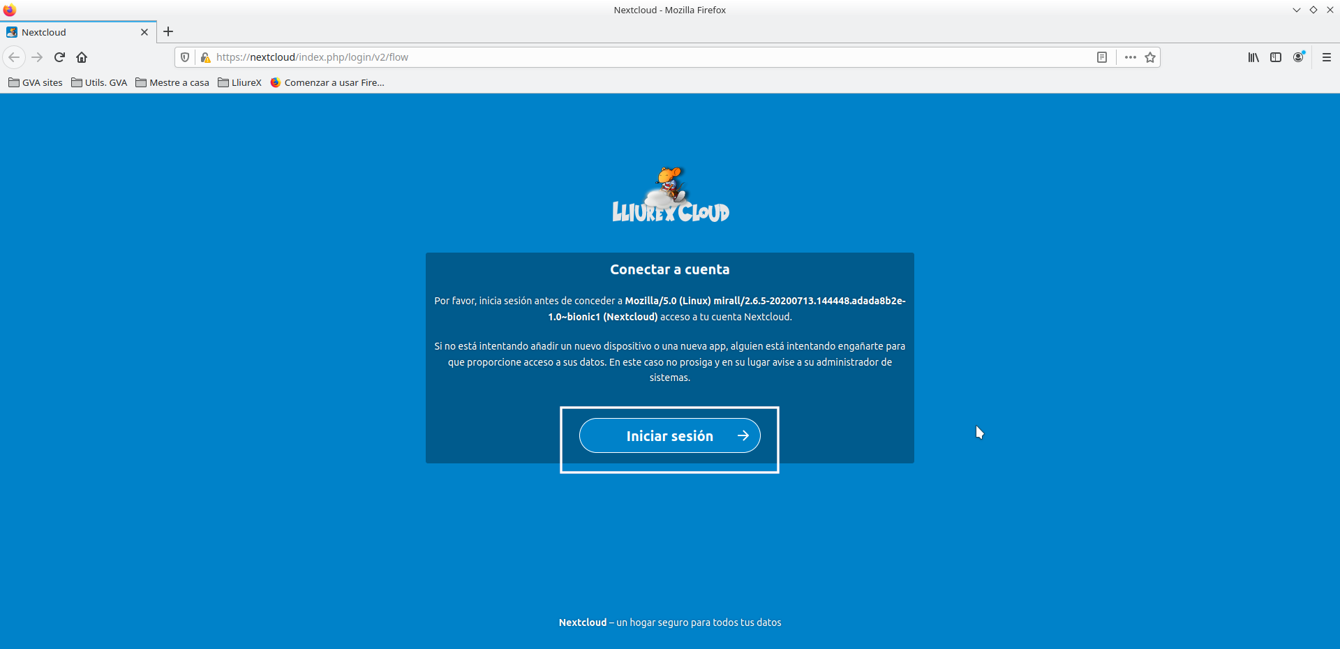 Trás aceptar el mensaje de advertencia (en el caso de que se haya mostrado) se mostrará una ventana con un aviso del servidor de Nextcloud. Se hará clic en “Iniciar Sesión”