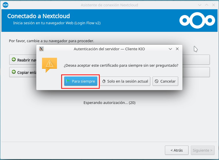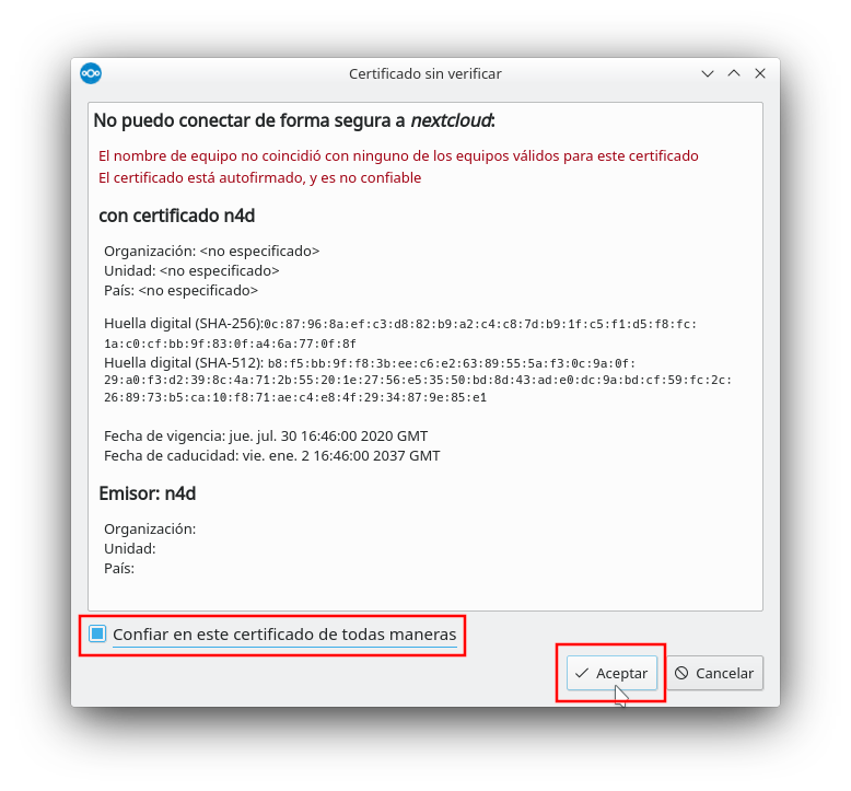 Se mostrará una ventana avisando de que no es posible conectarse al servidor de Nextcloud de forma segura. Se marcará la casilla “Confiar en este certficado de todas maneras” y se hará clic en “Aceptar”