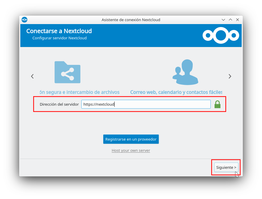 A continuación se introducirá la url del servidor de Nextcloud del centro. En aquellos equipos conectados directamente a la red de centro la url seria https://nextcloud. Si el equipo donde se desea configurar Nextcloud Desktop se conecta al servidor de Nextcloud desde la red externa (por ejemplo desde un portatil con wifi) la url que habria que indicar seria: https://ip_externa_servidor/nextcloud.