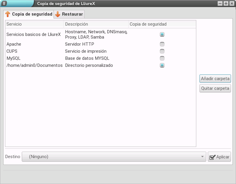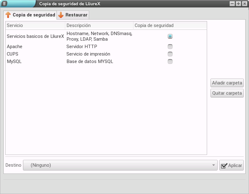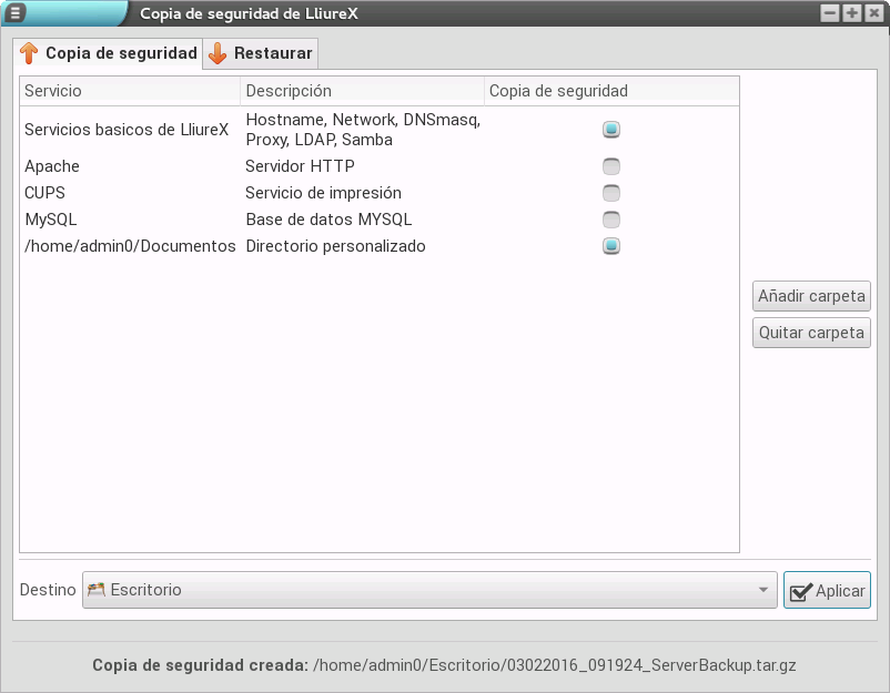 Una de las tareas más complejas a la hora de realizar una migración o borrado, es el almacenamiento de los datos de los usuarios mediante la realización de una copia de seguridad. LliureX nos ofrece la herramienta LliureX Backup, la cual permite realizar copias de respaldo de los servicios del servidor de aula. Concretamente, los servicios agrupados son: hostname, red, dnsmasq, samba, pamnsswitch, CUPS (configuración, impresoras y PPD), Apache (configuración del servicio, /var/www y todos los easy-sites), MySQL (password de root y volcado de la base de datos completa).