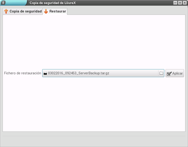 El proceso para restaurar una copia es más sencillo que el anterior, ya que únicamente tenemos que dirigirnos a la pestaña Restaurar, seleccionar un fichero y pulsar el botón Aplicar.