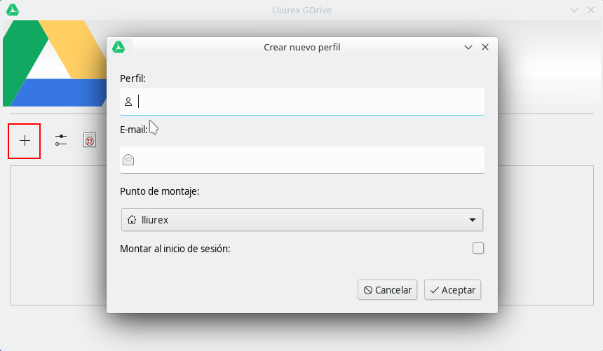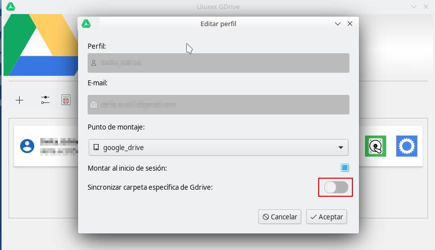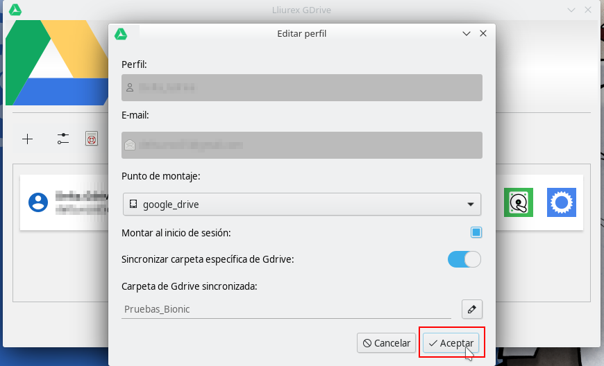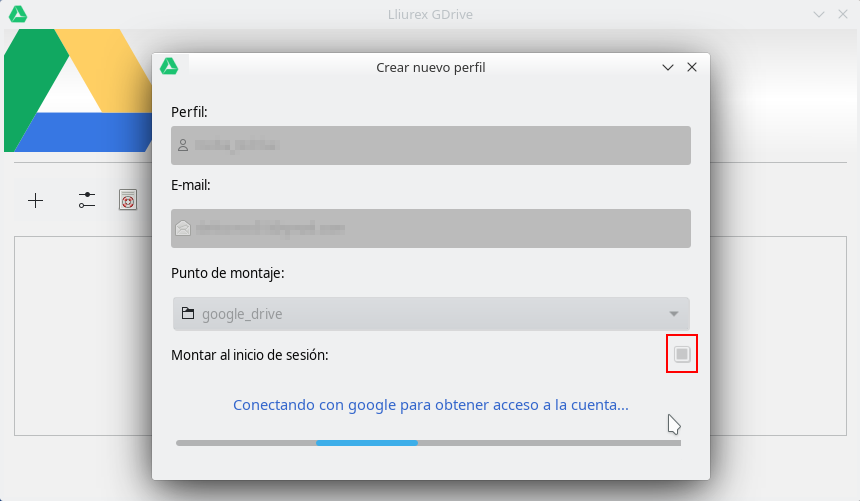 Es NECESARIO crear una nueva carpeta donde se va a montar la carpeta (por ejemplo google_drive), también podemos decidir si queremos que se monte al inicio de nuestra sesión. Entonces le damos a Aceptar y empezará la sincronización con Google.