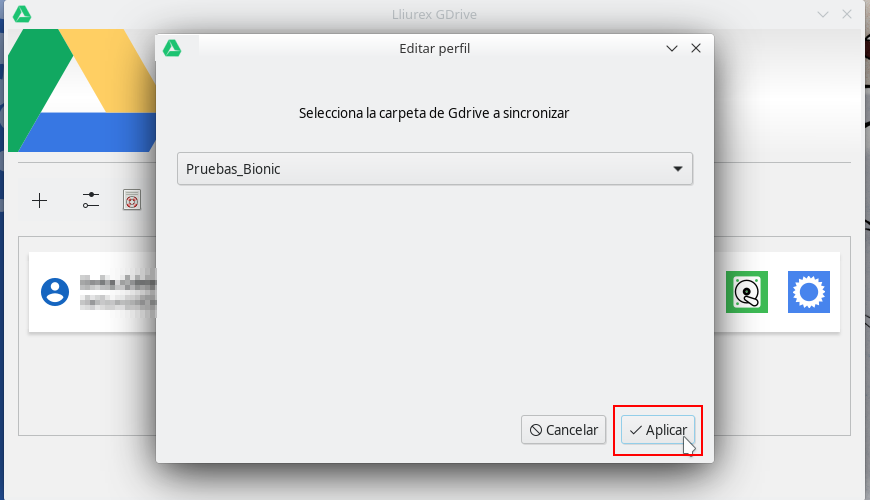 Una vez seleccionemos la carpeta que queremos sincronizar, pulsaremos sobre el botón Aplicar.