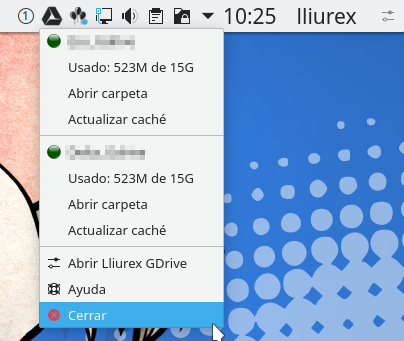 En la barra de notificaciones nos aparecerá un icono del Lliurex GDrive. Si pulsamos sobre és nos aparecerá un menú donde podremos ver el estado de nuestra cuenta. Tenemos las siguientes opciones: