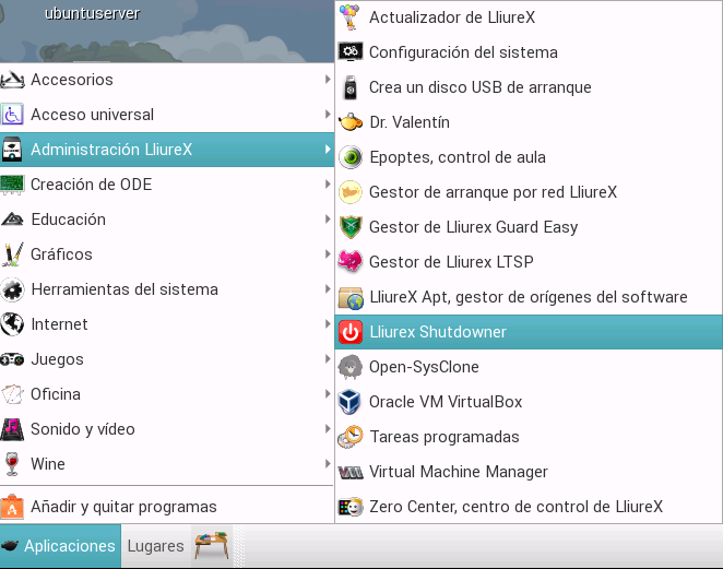 En un principio todo viene instalado por defecto en los servidores de LliureX, por lo que podemos acceder a la aplicación a través del menú: Aplicaciones -> Administración LliureX -> Lliurex Shutdowner.