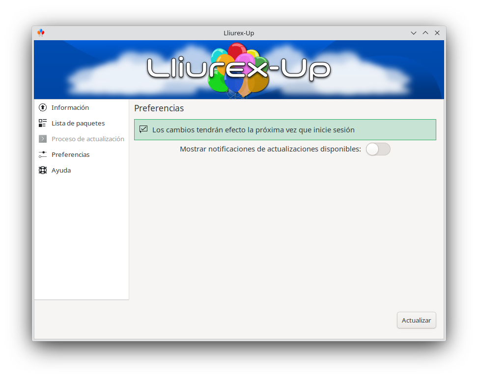 La desactivación del aviso de nuevas actualizaciones puede realizarse desde el panel Preferencias de Lliurex-Up (opción no disponible para los clientes):
