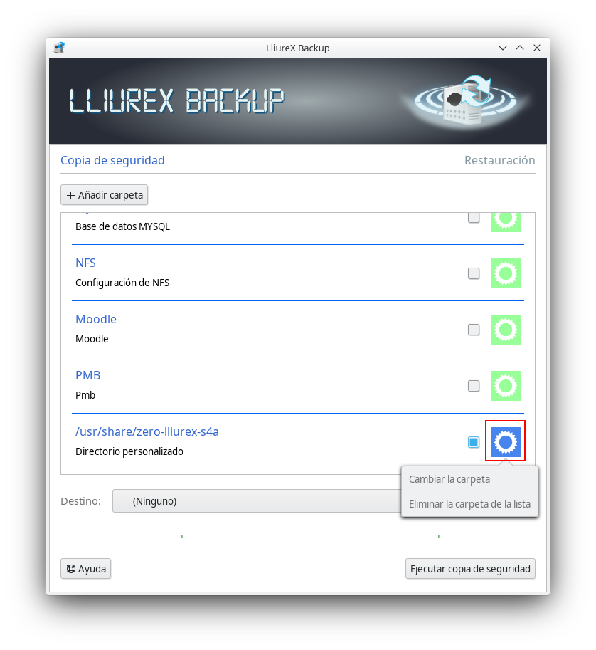 Una vez seleccionado, se muestra una ventana mediante la cual podemos acceder a la herramienta Gestor de copias de respaldo de LliureX (pestaña Sistema).