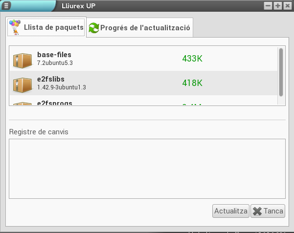 Si el sistema té actualitzacions pendents d'aplicar, les mostra en una finestra semblant a aquesta. En cas de voler actualitzar, polsem el botó Actualitza.