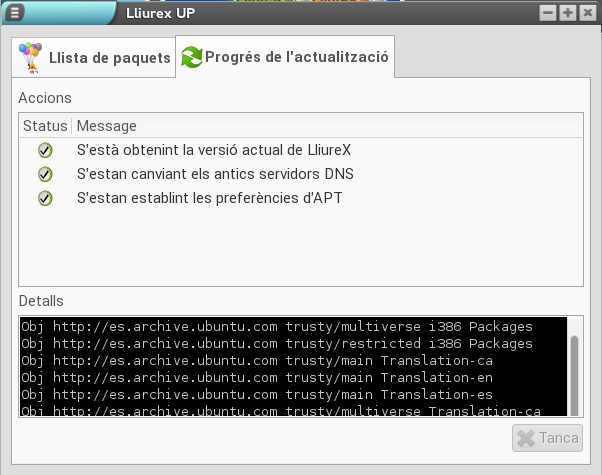 A continuació apareix, en la finestra de l'aplicació, una pestanya de progrés en la qual podem seguir el procés d'actualització i interactuar-hi, si és necessari, utilitzant la zona inferior de la finestra, que conté els detalls d'instal·lació.