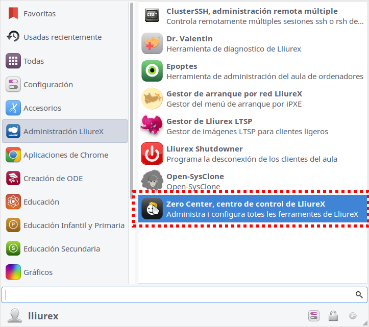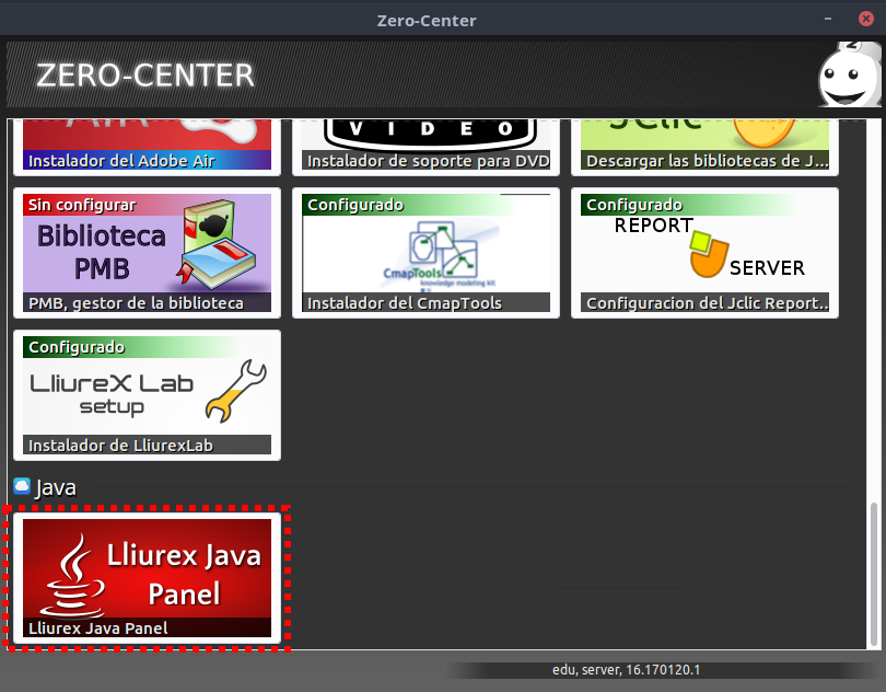 Podemos acceder al LliureX Java Panel desde Inicio > Administración LliureX > Zero center, centro de control de LliureX: