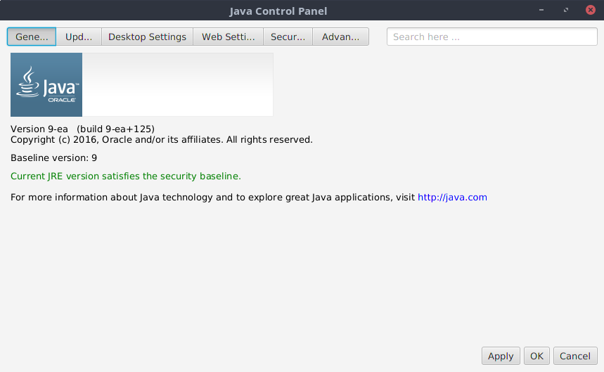 Si pinchamos sobre la opción nos aparecerá el panel de control del Oracle Java 9. Ten en cuenta que no todas la versiones tienen una panel de control, así, por ejemplo el OpenJDK no dispone de panel de control y no nos aparece: