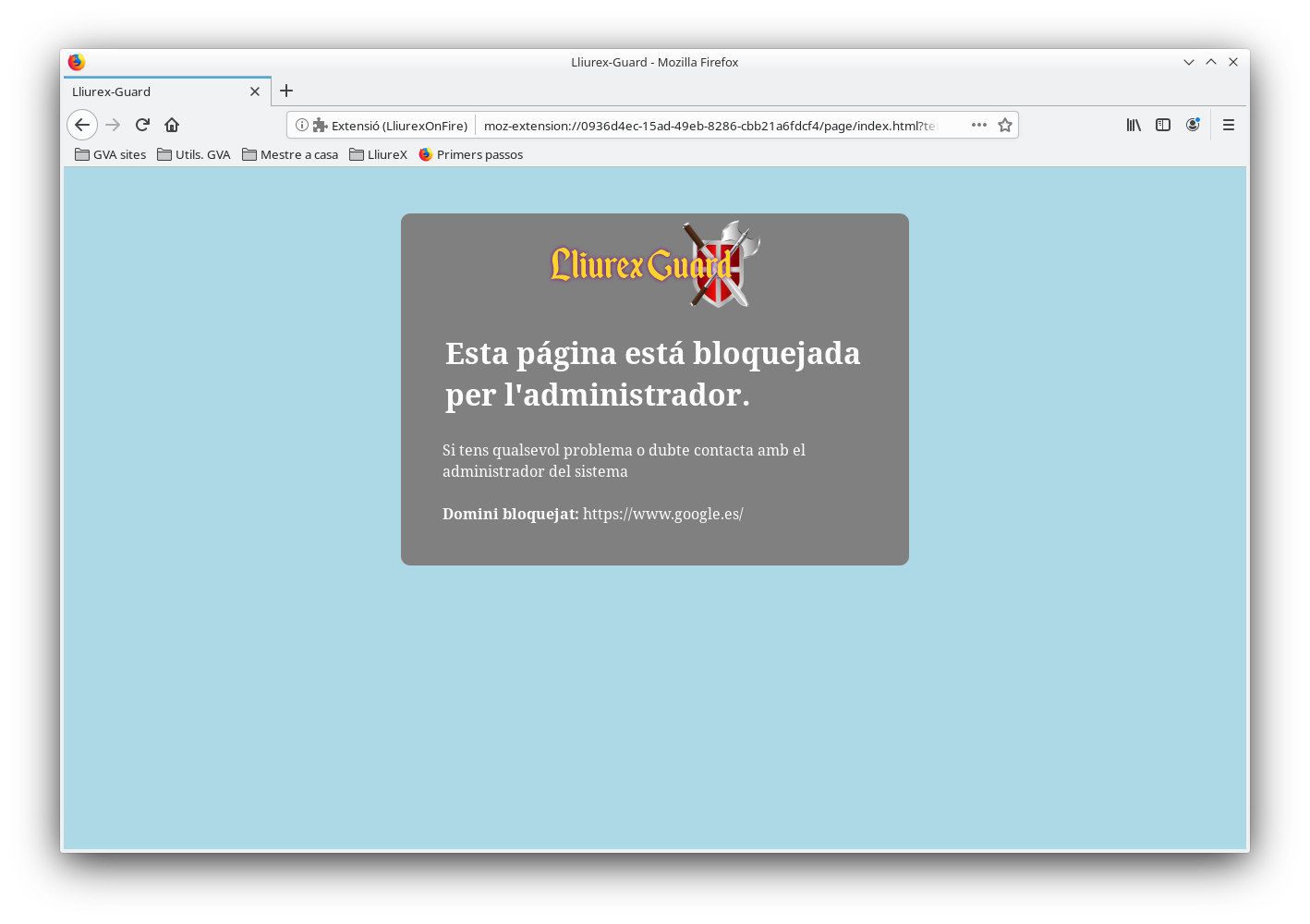 Cuando Lliurex Guard esta en funcionamiento (ya sea en modo Black List o White List) y se intenta acceder a alguno de los contenidos filtrados en las listas que se encuentran activas, se mostrará la siguiente pantalla en el navegador.