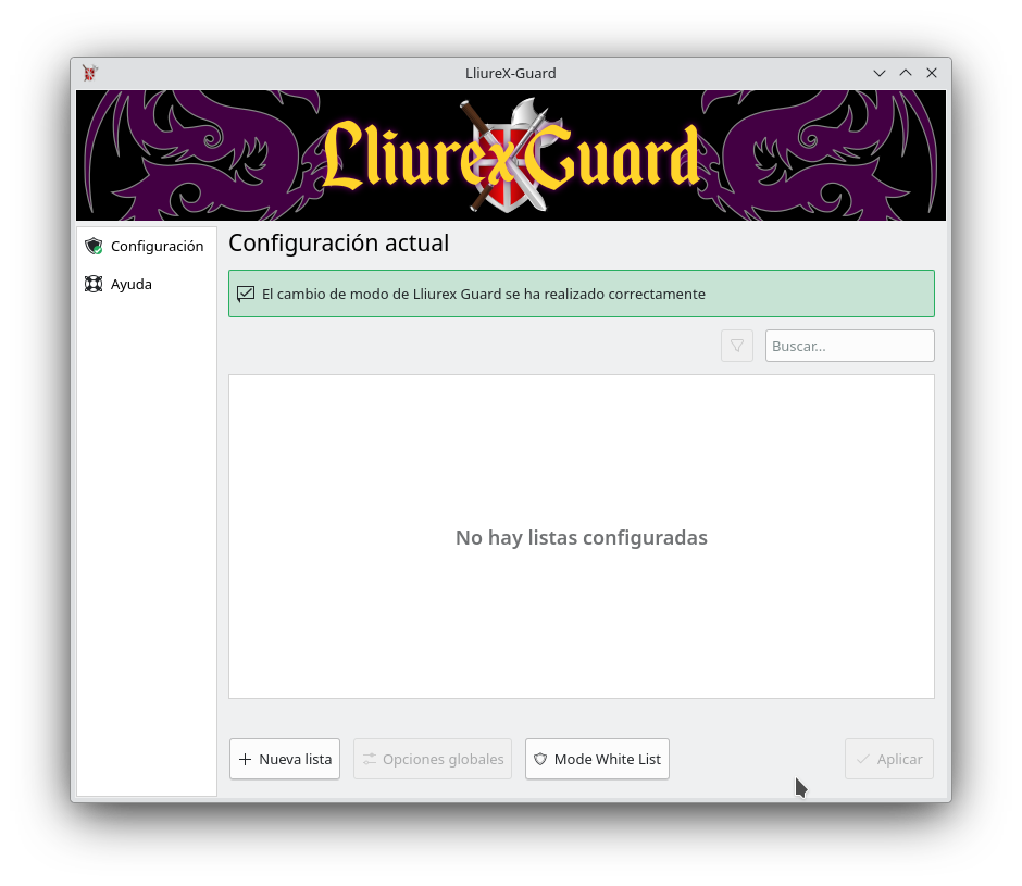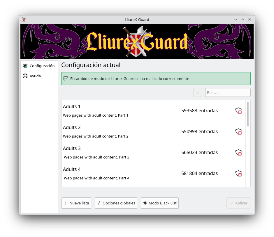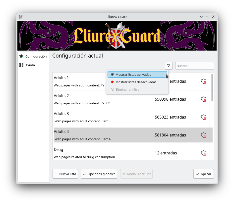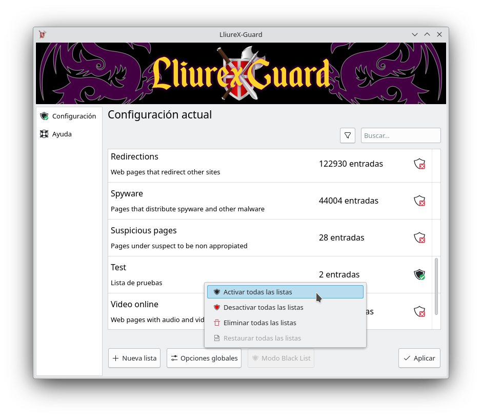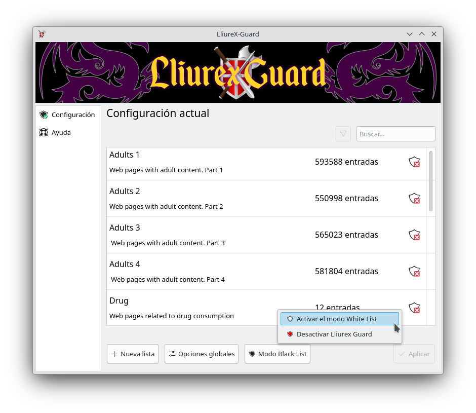 Si se desea cambiar el estado de todas las listas (para el modo en que se encuentre Lliurex Guard) se hará clic sobre la opción correspondiente de la barra de menú.