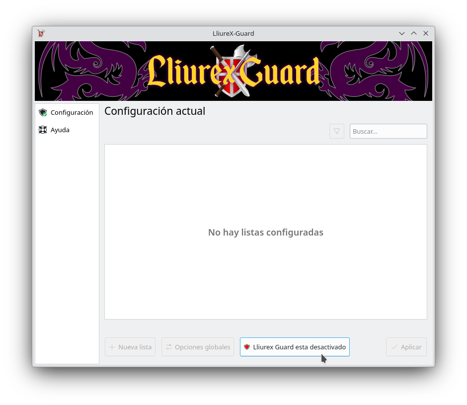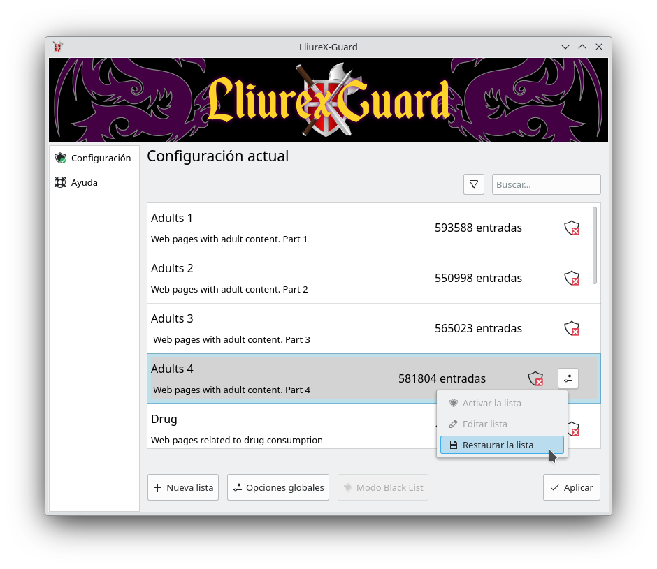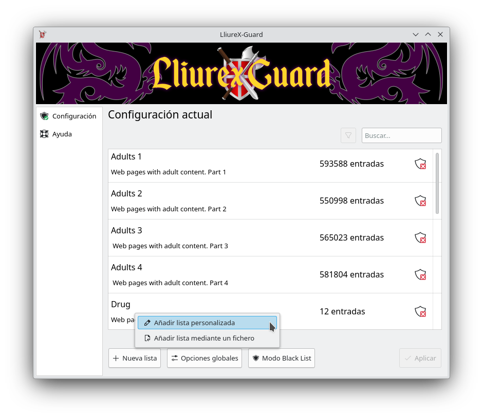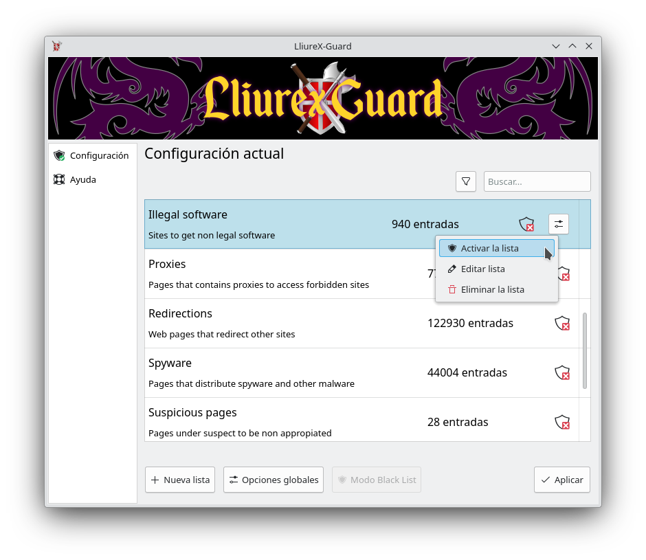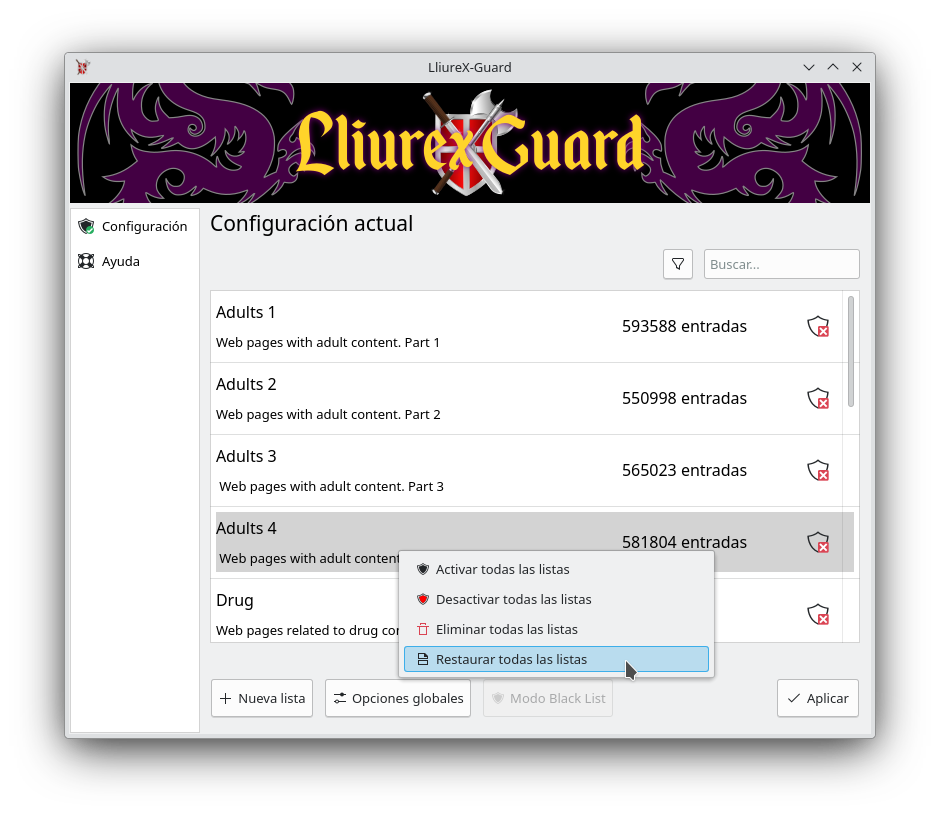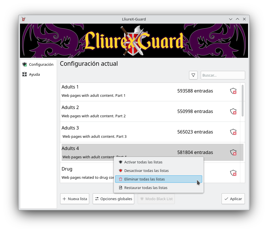 Si se desea cambiar el estado de todas las listas (para el modo en que se encuentre Lliurex Guard) se hará clic sobre la opción correspondiente de la barra de menú.