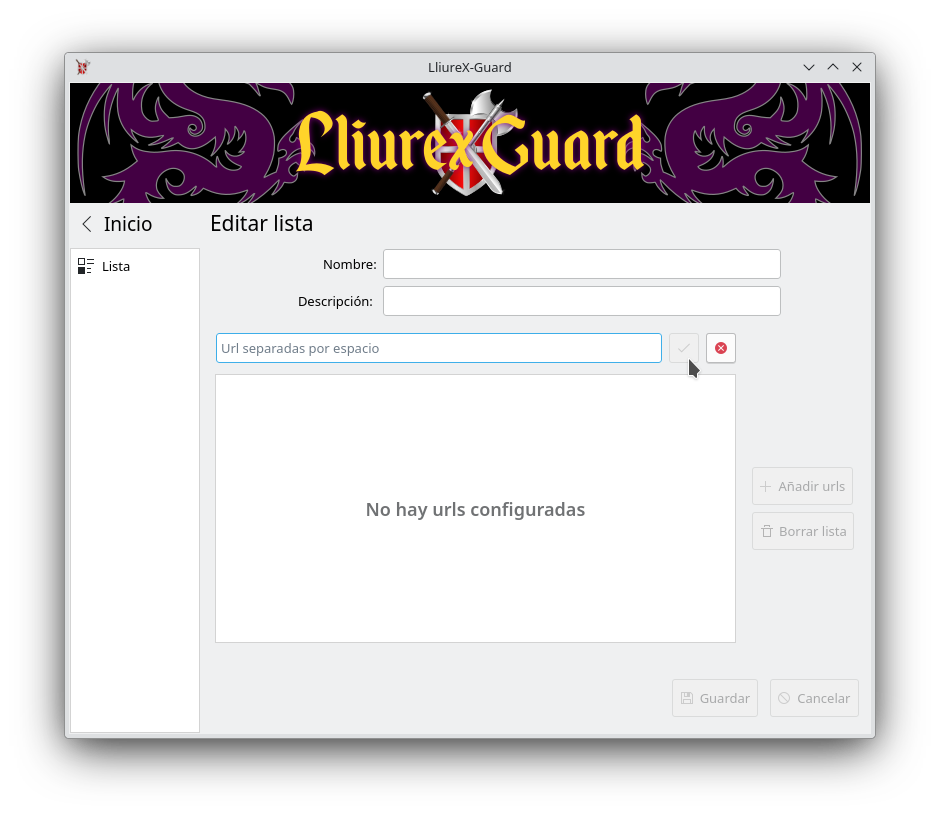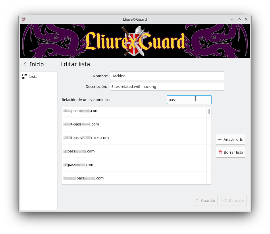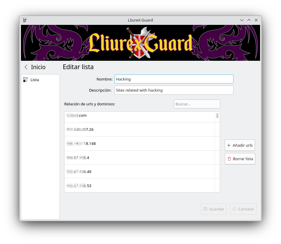 - Relación de urls y dominios: para introducir la lista de urls y dominios que se desea filtrar. La url introducida no debe contener http://o https:// así como ningún carácter especial al inicio de la misma (.,-,*,#...).