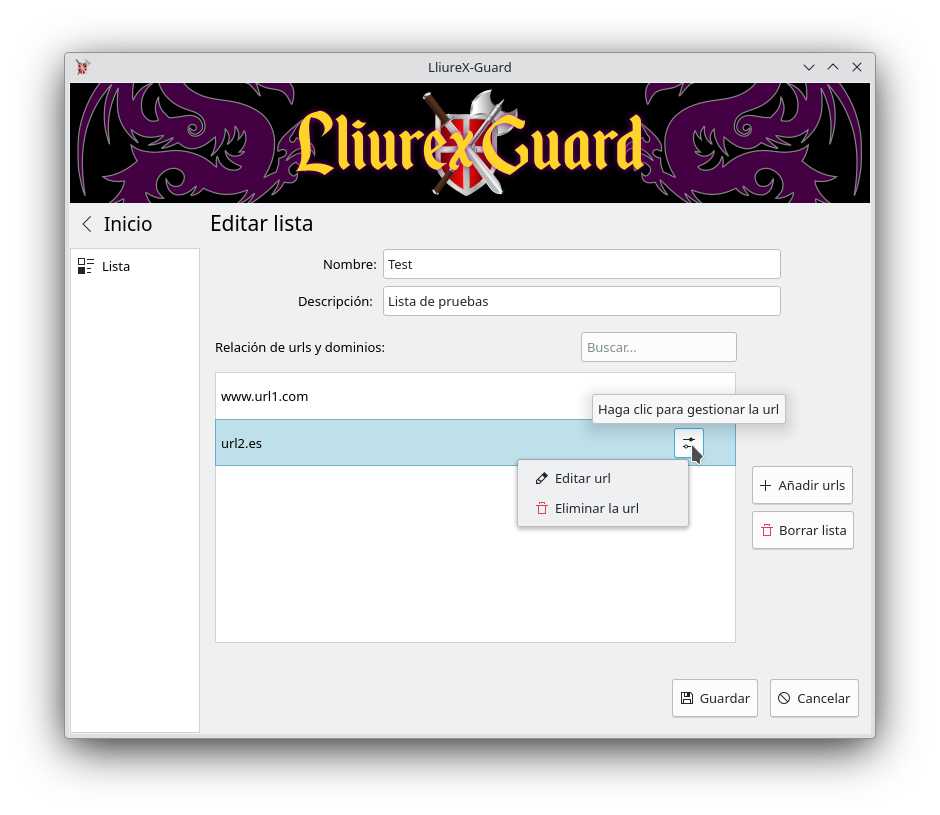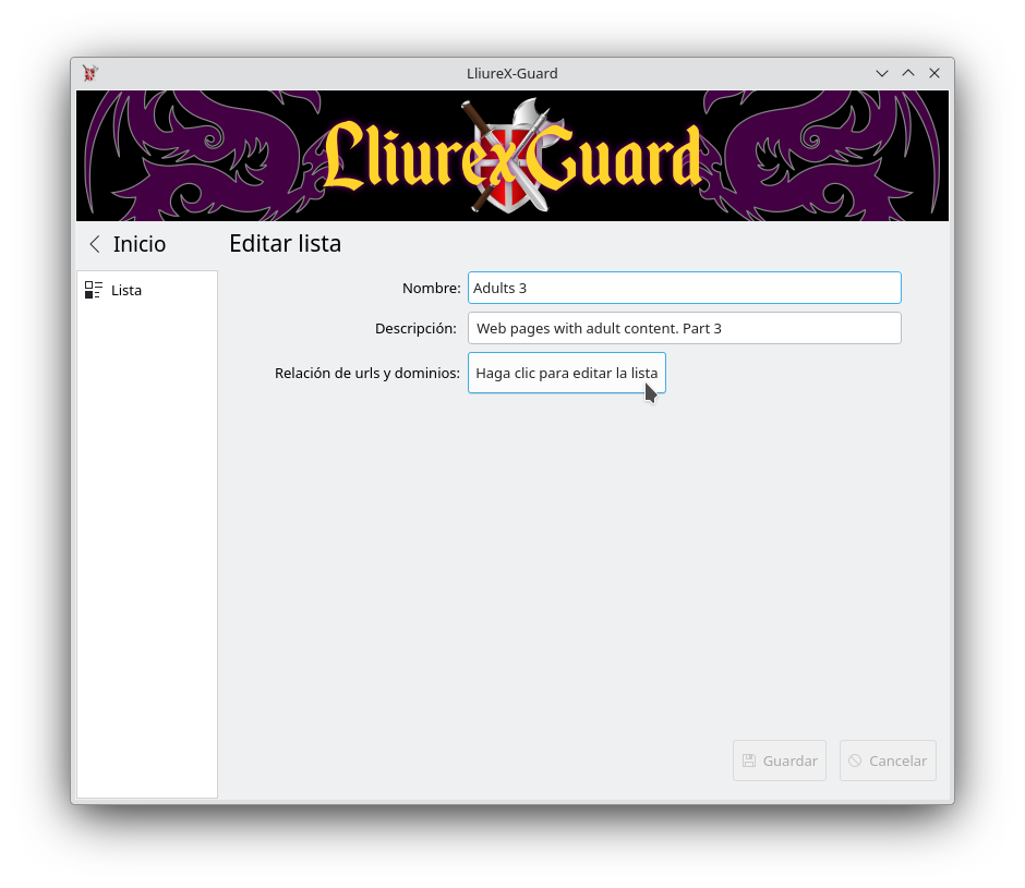 Al hacer clic se mostrará el formulario para la edición de la lista. Al igual que ocurre con la creación de listas mediante un fichero, si el número de entradas de la lista es menor de 2500 en el apartado de Relación de url y dominios se mostrará la relación de url contenidas en la lista.