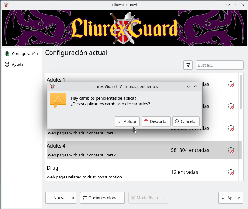 Si al salir de la aplicación se detecta que se han realizado cambios en las listas que no se han aplicado, se mostrará un mensaje de alerta para que el usuario pueda cancelar la salida y aplicar los cambios. Si se sale de la aplicación sin aplicar los cambios estos se perderán.