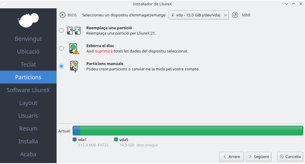 Para ello lo que vamos a hacer en lugar de eliminar LliureX y reinstalar es ir a Manual en el instalador y seleccionar el disco donde tenemos /net: