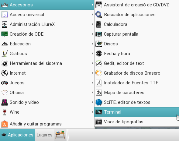 A continuación comprobamos que las tarjetas de red tienen las direcciones IP correctas. Para ello debemos acceder al Terminal, accediendo al menú Aplicaciones > Accesorios > Terminal.