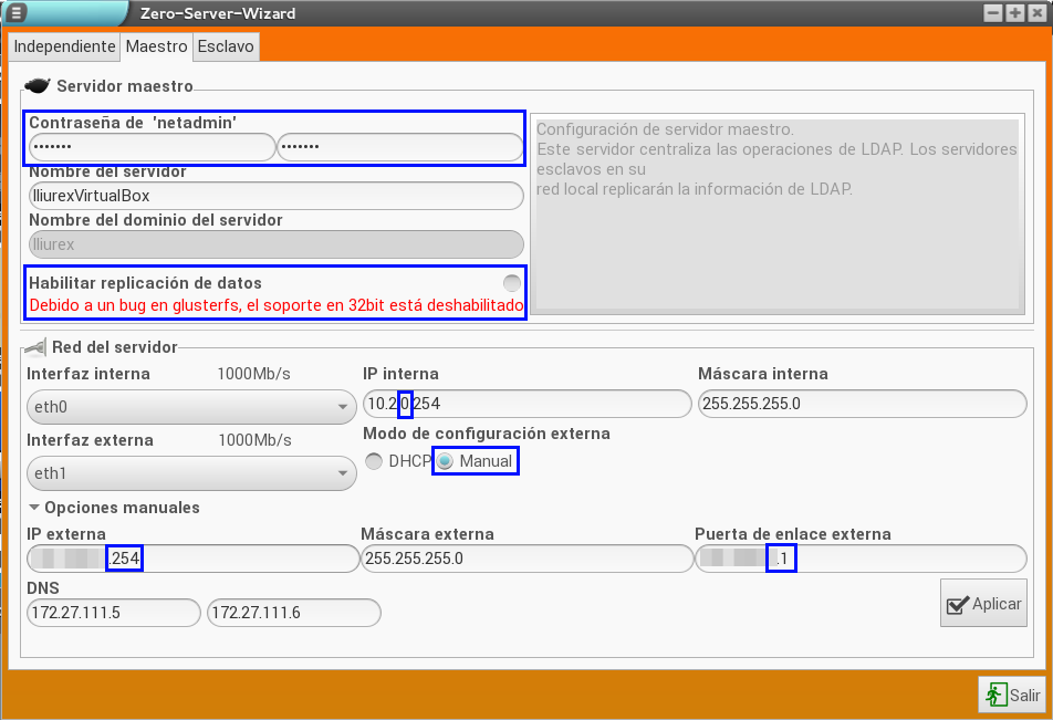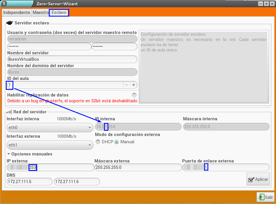 La inicialización del servidor de aula se realiza de manera similar a la que hemos realizado en el de centro. Para ello utilizamos la aplicación Zero Server Wizard, la cual indicará que está sin configurar (en color rojo). Si pulsamos sobre la aplicación, se abre una ventana en la que se muestran varias pestañas, de las que debemos seleccionar la de Esclavo. Los elementos importantes que hay que configurar son: