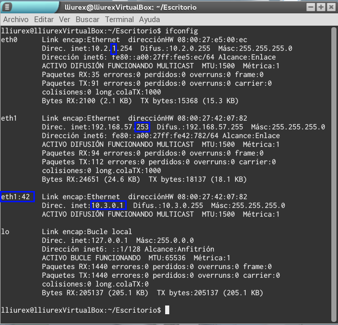 Cuando se abre, ejecutamos la orden ifconfig. En los datos que aparcen debemos comprobar si la dirección de la interfaz eth0 contiene la dirección IP con un 0 como tercer dígito, la eth1 contiene una dirección IP terminada en 254, y la eth1:42 contiene la dirección IP 10.3.0.254.
