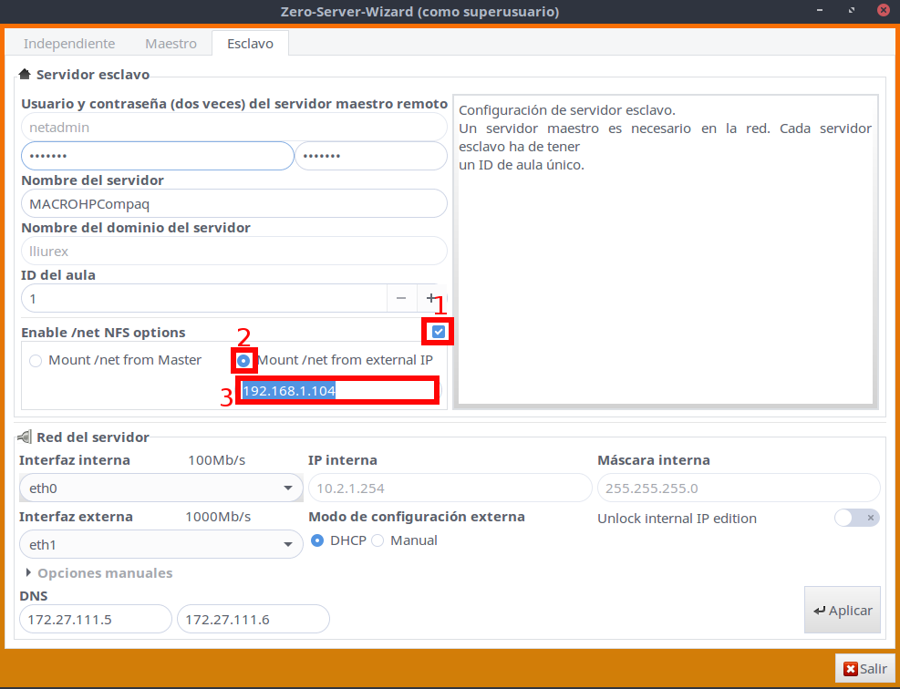 Para inicializar el servidor esclavo, nos vamos al servidor esclavo e iniciamos el zero-server-wizard, pero esta vez vamos a la pestaña donde pone Esclavo. En este caso debemos de proporcionar la contraseña de netadmin del servidor maestro y darle un número al servidor. Ten en cuenta que no puede haber dos aulas con la misma id, ya que éstas van asociadas a la ip, por lo que deberemos tener claro qué identificadores vamos a dar a cada servidor esclavo.