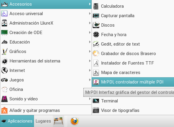 Para empezar a utilizar MrPDI tenemos que acceder al menú Aplicaciones -> Accesorios -> MrPDI, controlador múltiple PDI. Si no se encuentra ahí, hay que revisar si está instalado y en caso contrario instalarlo.