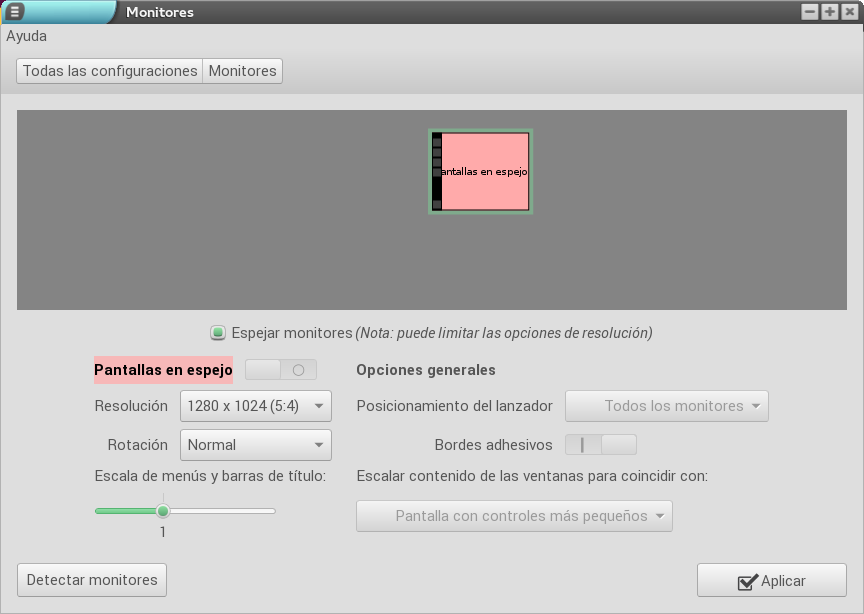 Cuando se utiliza un proyector con un ordenador que ya tiene conectado un monitor, se da el problema de ver en el proyector una parte del escritorio y en el monitor otra parte. Para solucionarlo y poder calibrar la pizarra como corresponde, tenemos que abrir el menú Aplicaciones -> Herramientas del sistema -> Preferencias -> Monitores. Una vez hecho, tenemos que marcar la opción Espejar monitores, con lo que obtenemos la misma imagen en ambos.