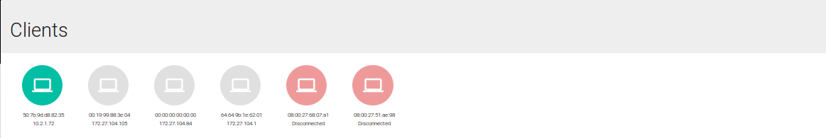 Podemos ver que algunos de los iconos se representan en verde, aquellos que están conectados, en rojo, los que no, o en gris los que no están configurados. Nuestros clientes son los que presentan la ip 10.2.X.X, los demás ordenadores serán bien servidores esclavos/maestros u otros ordenadores que tenemos conectados al servidor con una ip propia.