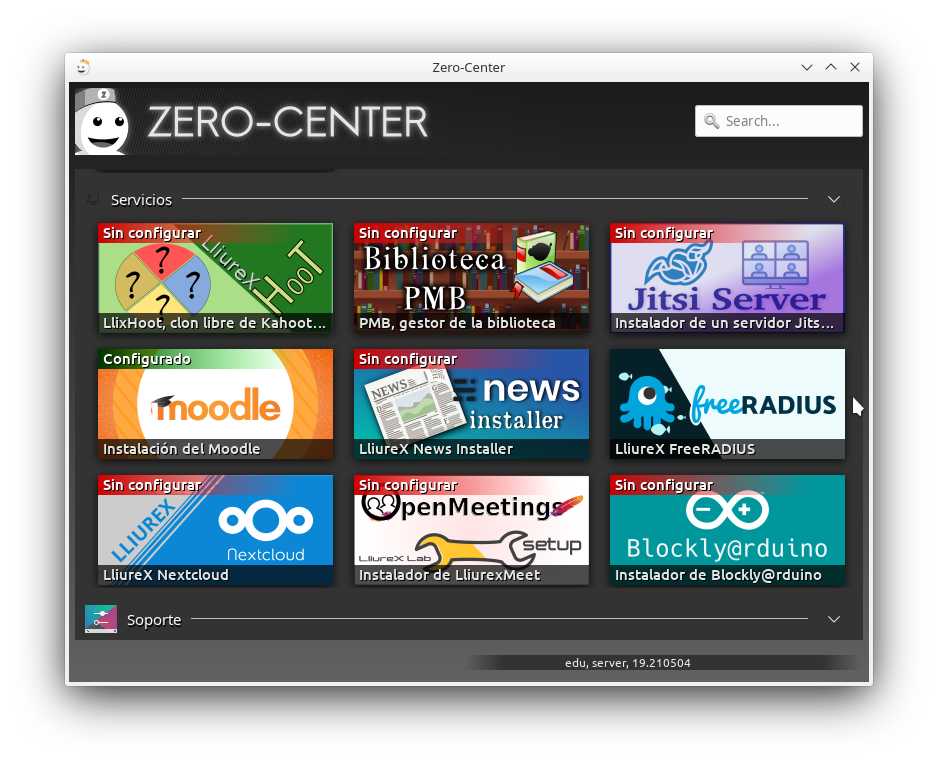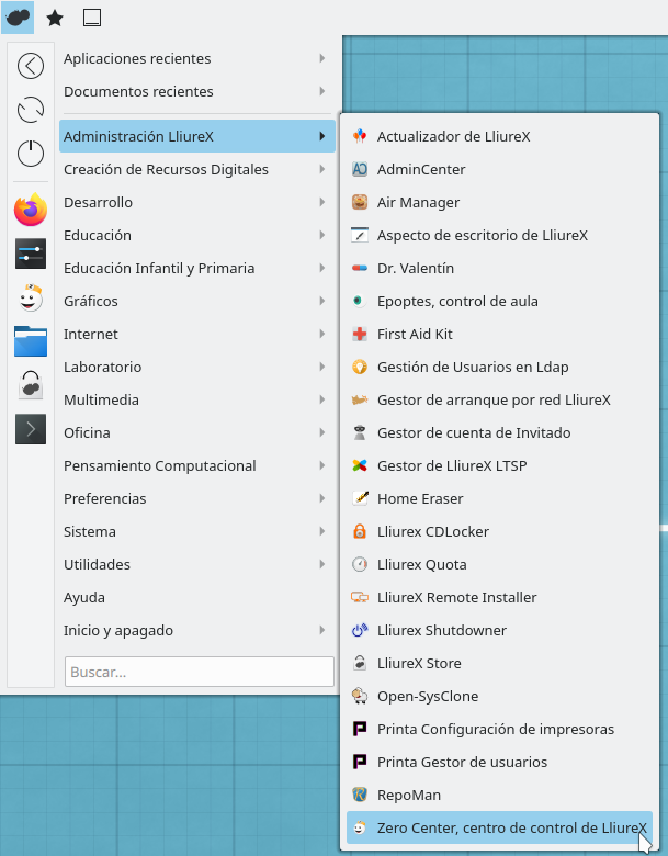 PMB no está instalado por defecto ni en los servidores ni en los clientes, por lo que tenemos que instalarlo. Para ello nos dirigimos al menú: Aplicaciones -> Administración LliureX -> Zero Center, Centro de control de LliureX (el aspecto de este menú puede variar en función de la versión de LliureX y/o de la personalización realizada por el usuario)