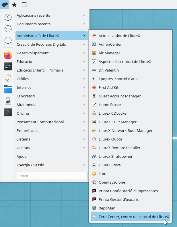El PMB no està instal·lat per defecte ni en els servidors ni en els clients, per la qual cosa hem d'instal·lar-lo. Per a això ens dirigim al menú Aplicacions -> Administració de LliureX -> Zero Center, centre de control de LliureX (l'aspecte d'aquest menú pot variar en funció de la versió de LliureX i/o de la personalització realitzada per l'usuari).