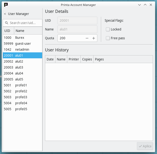 La gestión de las cuotas de impresión se facilita dentro del aula, con un software gratuito y libre que nos permite un control sobre usuarios, grupos y la opción de recarga automática.
