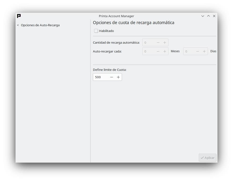 • A la derecha todo aquello referente a las recargas automáticas, que serán programables para todos, es decir cualquier cosa programada aquí afectará a todos los usuarios de Printa: