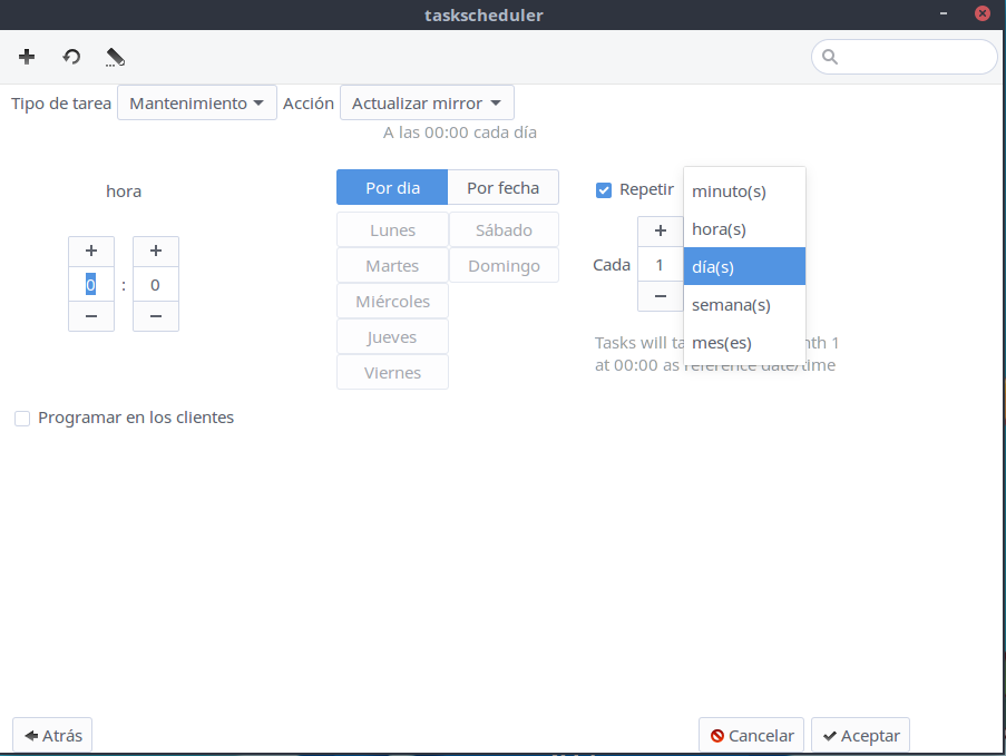 Para programar una tarea de este tipo basta con seleccionar una hora y un(os) día(s) de la semana.