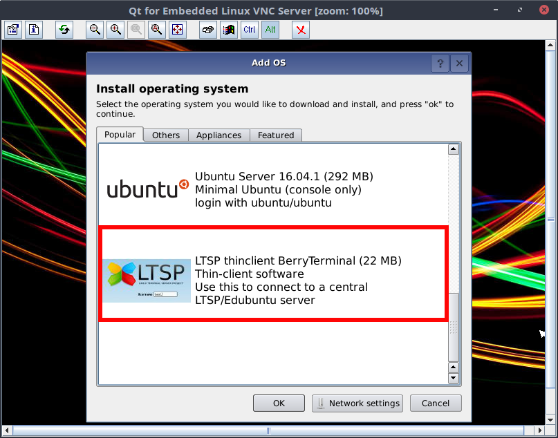 En nuestro caso vamos a seleccionar LTSP thinclient BerryTerminal que es una pequeña imagen, como puedes comprobar, que lo único que va a hacer es buscar nuestro servidor LTSP y arrancar la imagen por defecto. La raspberry sólo hará de cliente ligero, por lo que NADA se ejecutará en la Raspberry.