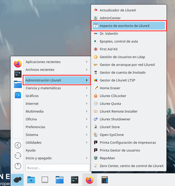 Para ejecutar la aplicación hay que acceder al Menú>Administración de Lliurex>Aspecto de escritorio de LliureX.