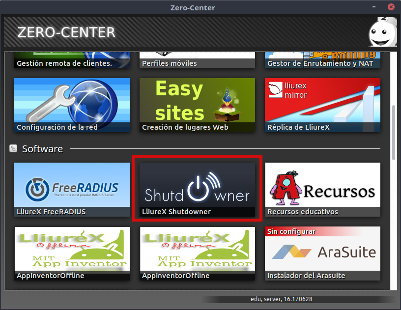 Para iniciar la aplicación vamos al Zero-center e iniciamos el LliureX Shutdowner: