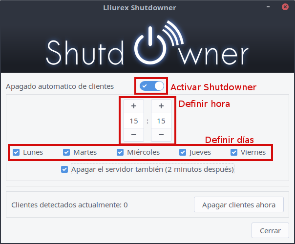El LliureX Shutdowner ha sufrido una actualización respecto al LliureX Shutdowner en LliureX 15, en la versión 15 permite el cierre de los clientes conectados a un servidor, ligeros, semiligeros y pesados.