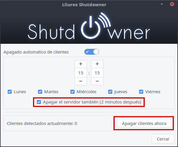 Asimismo tenemos la opción de que el servidor también se apague 2 minutos después de los clientes. Además tenemos la opción de Apagar todos los clientes en ese mismo instante.