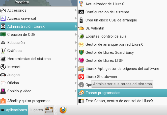 En un principio todo viene instalado por defecto en LliureX, por lo que podemos acceder a la aplicación a través del menú Aplicaciones -> Administración LliureX -> Tareas programadas.