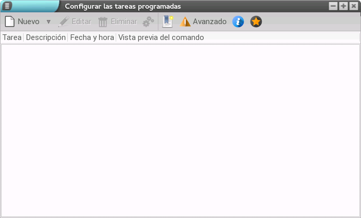 Para crear una nueva tarea programada, lo primero que tenemos que hacer es pulsar el botón Nuevo o seleccionar uno de los tres tipos de tareas que se ofrecen (usando la flecha situada a la derecha del botón anterior):