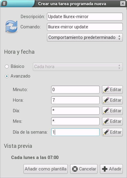 Por ejemplo, si queremos que se actualice el mirror del servidor cada lunes a las 7 de la mañana, debemos configurar los parámetros como se muestran en la imagen: